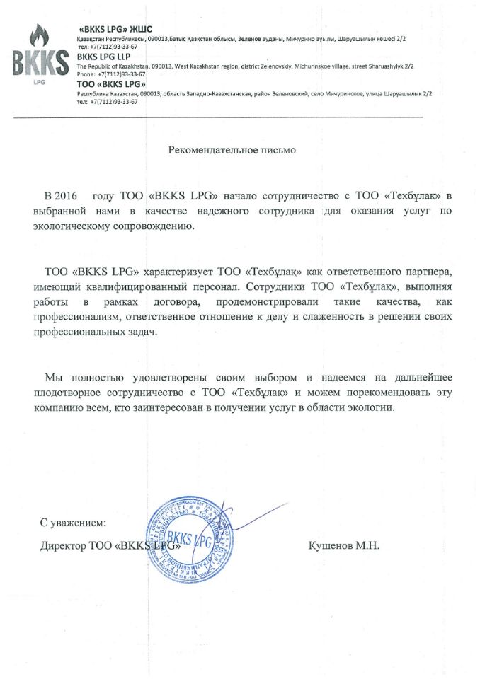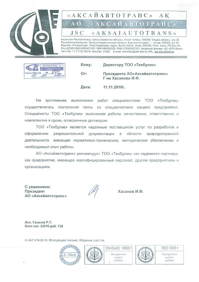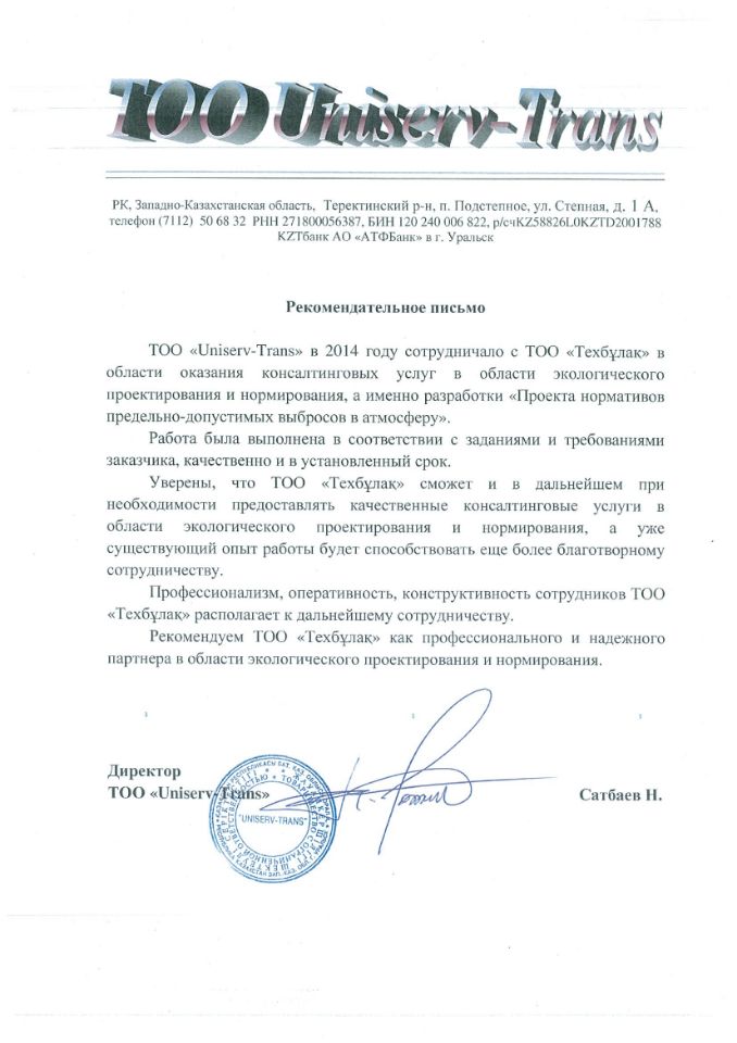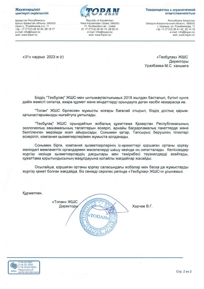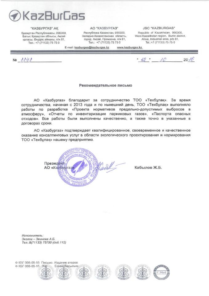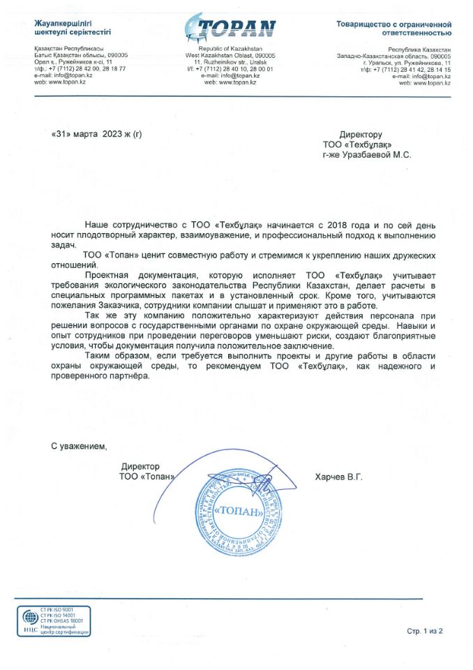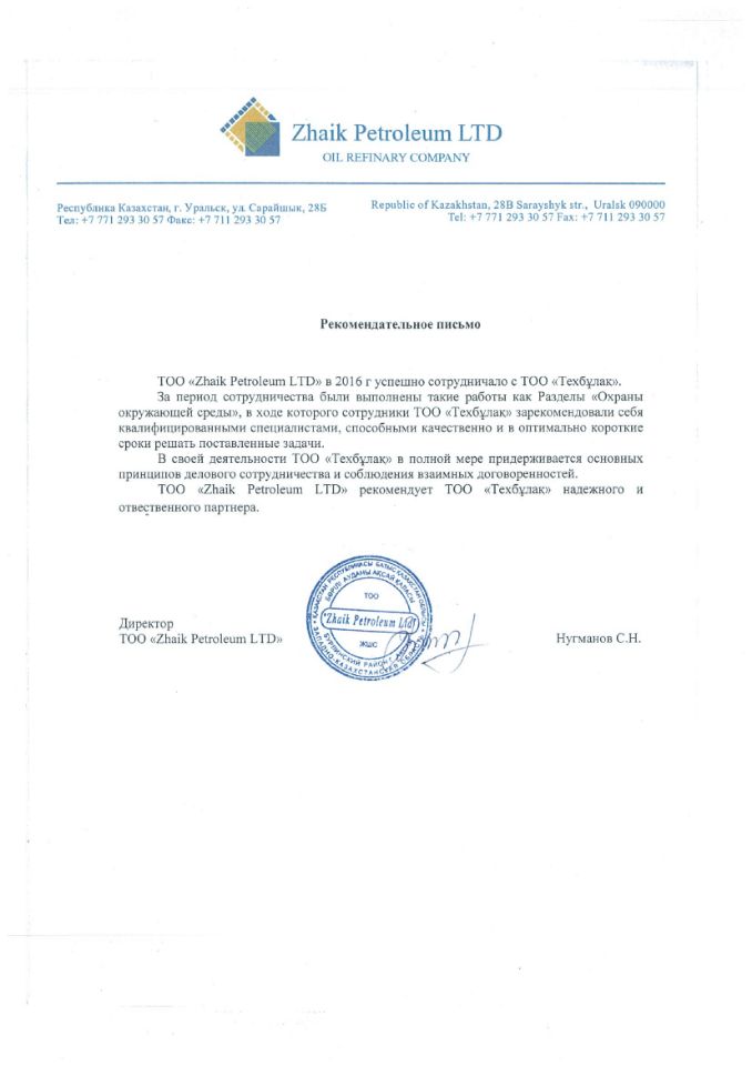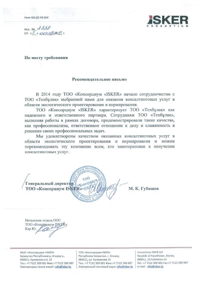 ТОО «Техбұлақ» ценит своих Заказчиков и ответственно относится к выпускаемым проектам, поэтому в период действия разработанной и согласованной уполномоченным органом документации, специалисты ТОО «Техбұлақ» при необходимости консультируют представителей Заказчика по разработанной документации.